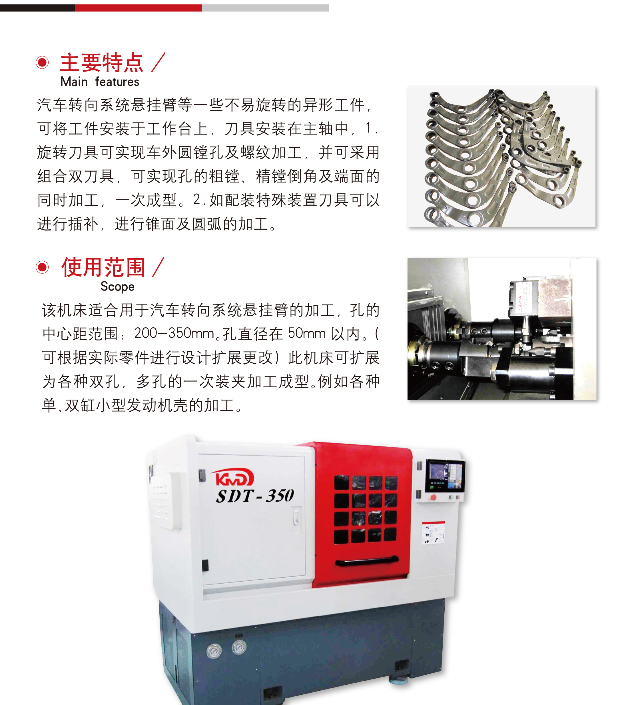 簡(jiǎn)要描述: 汽車轉向(xiàng)系統懸挂臂等一(yi)些不易旋轉的異(yi)形工件,可将工件(jiàn)🤟安裝于工作台上(shàng),刀具安裝在主軸(zhou)中,1 旋轉刀具🐕可實(shí)現車外圓镗孔及(ji)螺紋加工,并可采(cǎi)用組合雙刀具,可(ke)實現孔的粗镗、精(jing)镗倒角及端面的(de)同時加工,一次成(cheng)型。